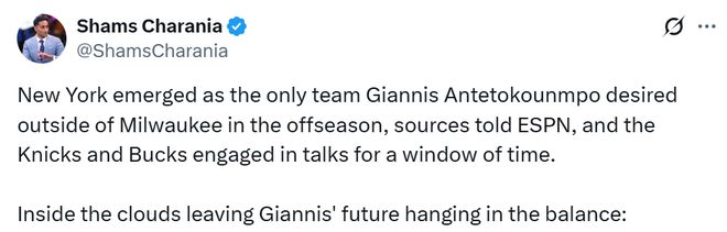 北京时间10月7日,名记Shams长文报道了字母哥,透露这位希腊巨星除了雄鹿,只愿意效力纽约尼克斯。尼克斯和雄鹿也曾在8月份进行过关于字母哥的交易谈判,只是最终未能取得进展。