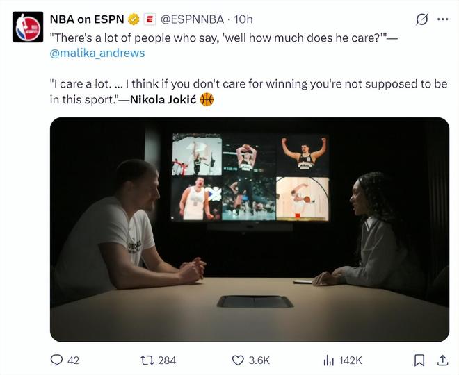 北京时间2月19日,约基奇做客ESPN的专访节目,在节目中谈到对竞技体育/篮球的看法,他说道:我非常在意输赢,如果你不在乎输赢就不该从事这项运动。这只是我的性格可能有点与众不同,我热爱篮球。